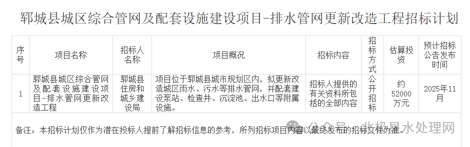 项目概况:项目位于郓城县城市规划区内,拟更新改造城区雨水、污水等排水管网,并配套建设泵站、检查井、沉淀池、出水口等附属设施。