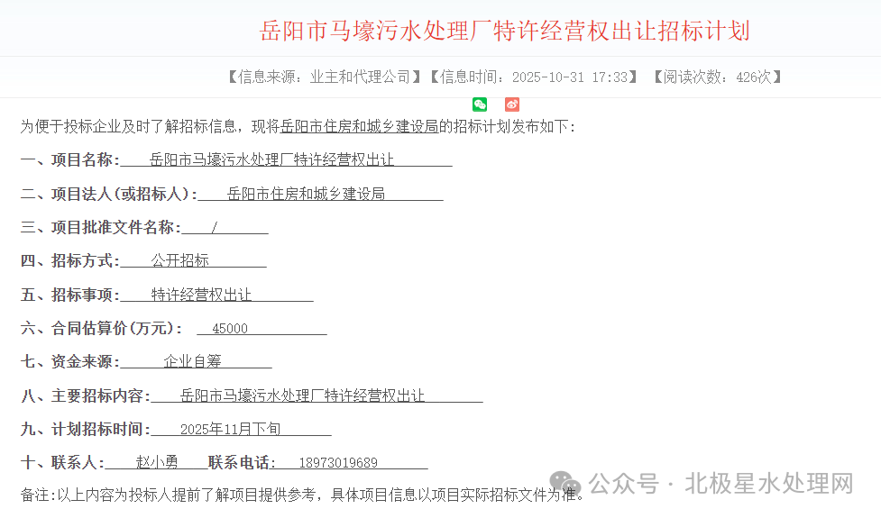 项目概况:岳阳市马壕污水处理厂特许经营权出让