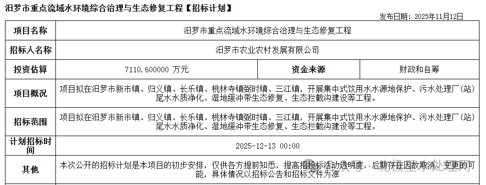 项目概况:拟在汨罗市新市镇、归义镇、长乐镇、桃林寺镇弼时镇、三江镇,开展集中式饮用水水源地保护、污水处理厂(站)尾水水质净化、湿地缓冲带生态修复、生态拦截沟建设等工程。