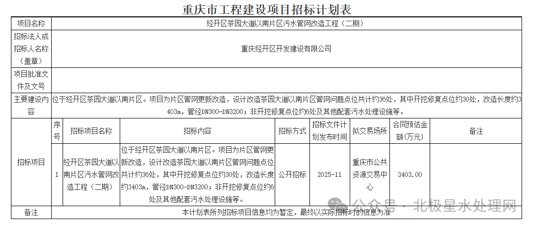 项目概况:位于经开区茶园大道以南片区。项目为片区管网更新改造,设计改造茶园大道以南片区管网问题点位共计约36处,其中开挖修复点位约30处,改造长度约3403m,管径DN300-DN3200;非开挖修复点位约6处及其他配套污水处理设施等。
