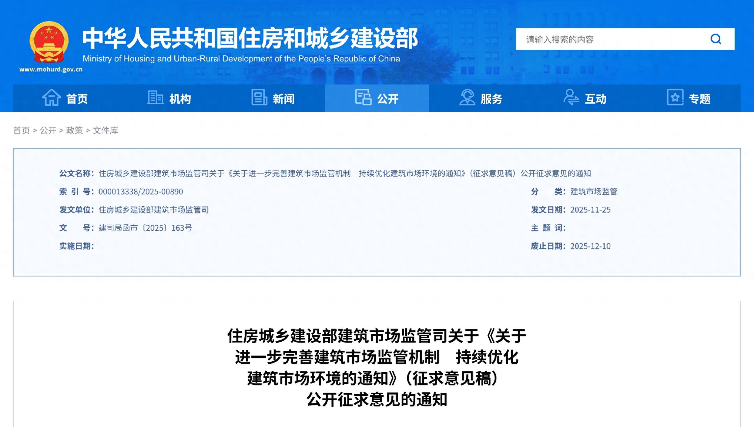 原文链接:住房城乡建设部建筑市场监管司关于《关于 进一步完善建筑市场监管机制 持续优化 建筑市场环境的通知》(征求意见稿) 公开征求意见的通知